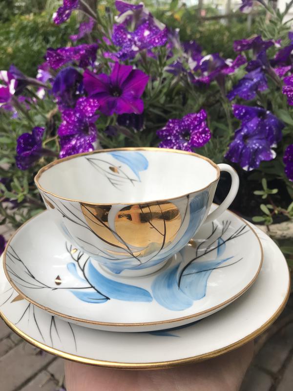 Настоящий фарфор из бабушкиного буфета. Красивая чайная тройка:чашка/блюдце/десертная тарелка-фарфор времён СССР.Дулевский Фарфоровый завод . Ручная роспись. Идеальное состояние. Об»ем чашки-200 мл.