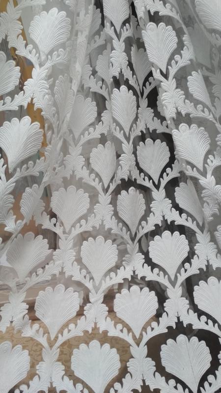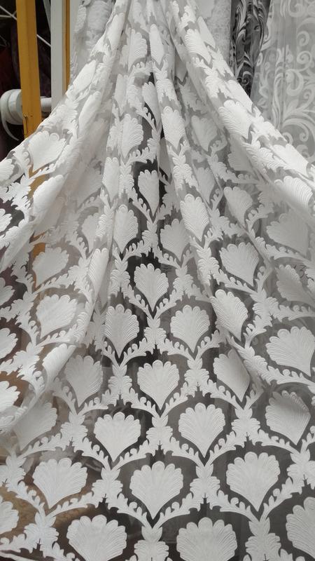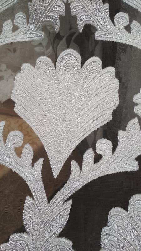 Дуже гарної якості, основа поліестер, напівпрозора тканина схожа на органзу. Виробництво Туреччина. Малюнок тканний, зроблений з ниток вплетенных в основу.