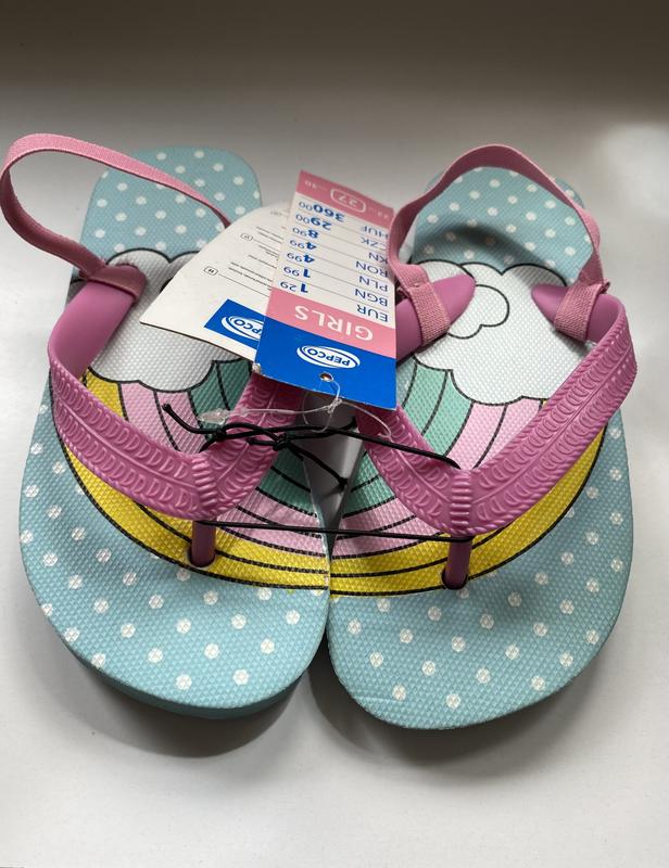 Дуже гарні світлі у веселковий принт шльопанці, в‘єтнамки.Голубо-рожеві тони, абсолютно нові.Ми переросли, перескочили розмір.Розмір вказано 27, орієнтуйтеся на заміри - 18,2 см стопа.Відправлю будь яким видом доставки.