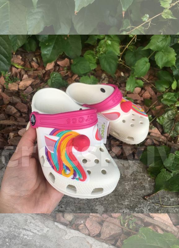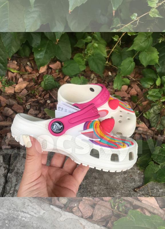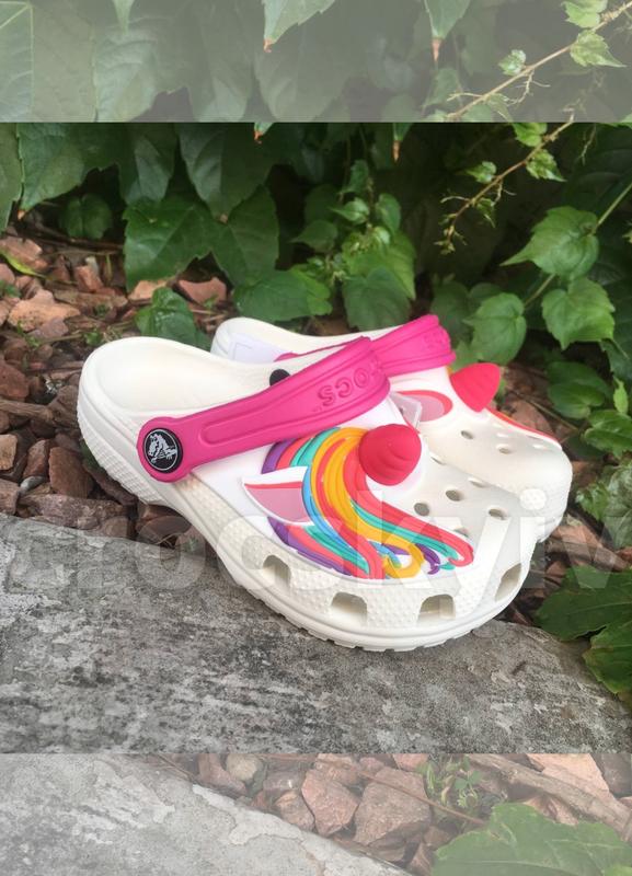 Кастомизированная линейка Crocs для деток в виде единорога и акулы. Это классические кроксы Classic Clog, но с дизайном в виде зверушек. Очень красивые и при этом очень удобны. Плотная подошва, верх с отверстиями для вентиляции, ремешок для поддержки пятки.