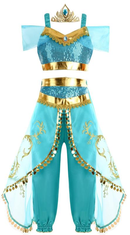 Костюм принцессы Жасмин - отлично подойдет для тематической вечеринки, утренника, дня рождения! До комплекту входить майка-топ, штаны, съемная брошь и золотая диадема. Все элементы костюма продуманы до мелочей. Штаны и топ содержат прорезиненные вставки для удобной посадки. Сочетание атласной ткани с фатиновыми вставками, пайетками и золотой отделкой делают образ 100% узнаваемым и создают атмосферу праздника! Размер: 5-7 лет (120 см) Материал: 100% полиэстер* *ввиду наличия множества декоративных элементов рекомендуем гладить изделие бесконтактным утюгом (отпаривателем)