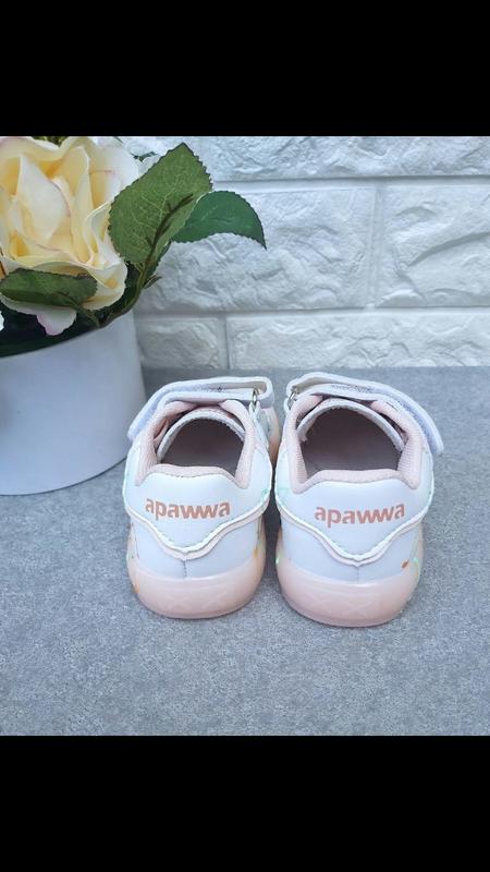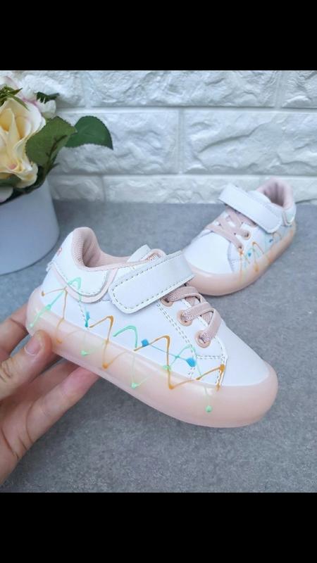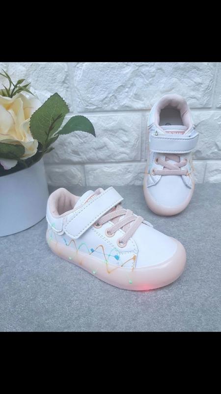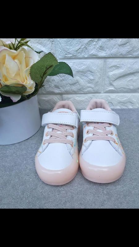 біло-персикового кольору Led , верх еко-шкіра, підошва покрита силіконом, захищає носочки від збивання та амортизують, устілка шкіряна з супінатором, регулюються ліпучкою та шнурками-резинками, світяться від батарейок.