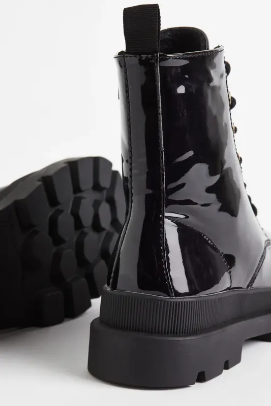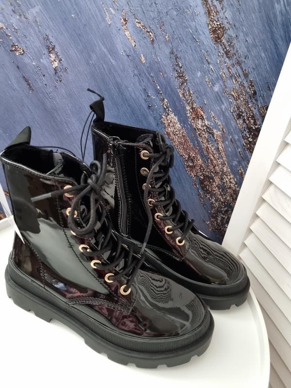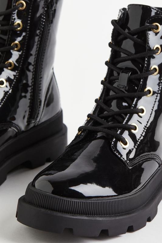 Блестящие сапоги в стиле панк. Классическая шнуровка, боковая застежка-молния и петля сзади для удобства надевания и снятия. Подкладка и стелька из мягкого велюра. Подошва 4,2 см.
