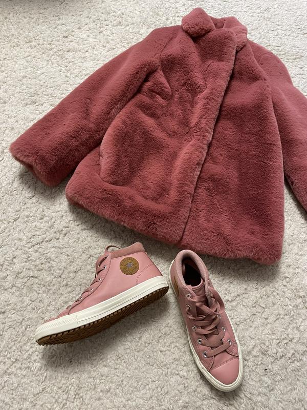 Состояние новой. Заміри на бірці на фото. Очень красивая плюшевая, мягенькая и теплая. Цвет кораллловый, или темно розовый. Защелкивается кнопкой. Есть в цвет кеды конверс 37 р. утепленные ( последнее фото)