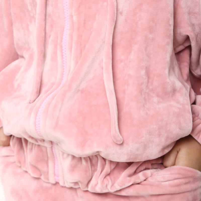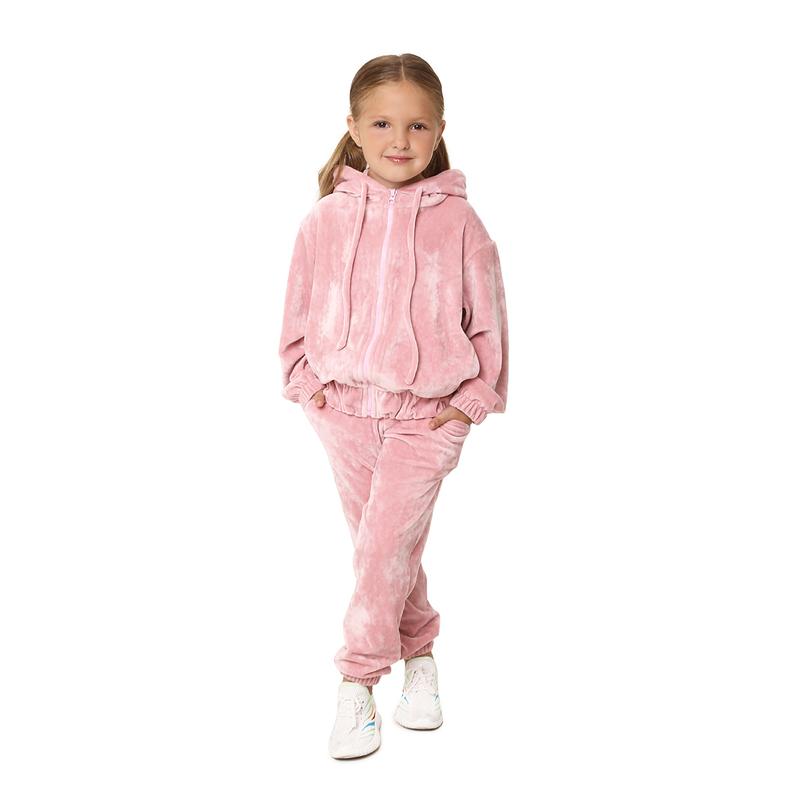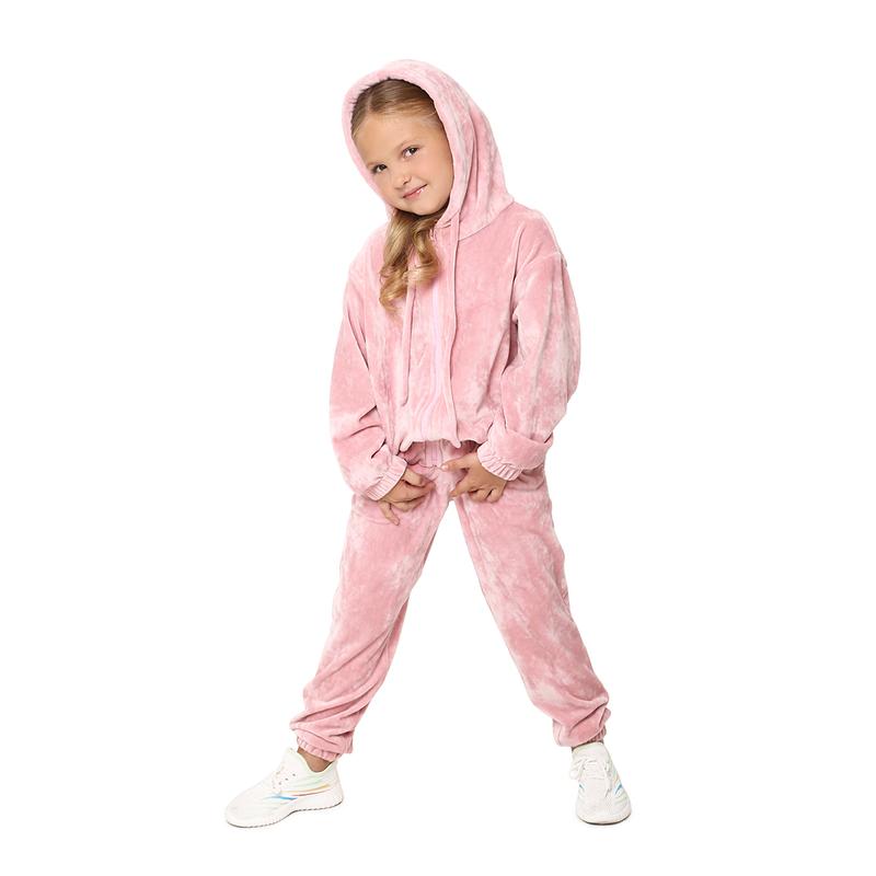 Нежный и удобный спортивный костюм для девочки из велюра. Кофта на молнии с удобными боковыми карманами и приспущенным рукавом. Молния обработана изнутри хлопковой лентой, для максимального комфорта, что позволяет носить костюм даже с тонкой футболкой. Двойной капюшон надежно защитит от ветра. Штаны имеют два боковых кармана. Манжеты рукавов кофты и штанов на резинке. Пояса на кофте и штанах выполнены с помощью специальной декоративной методики, что делает образ стильным.