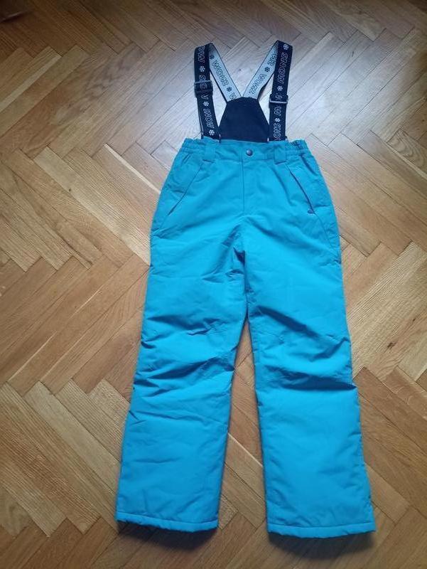 Лыжные брюки бирюзовые с подтяжками Рост 134-140 Пояс на резинке Низ брюк фиксируется липучками по бокам есть молнии