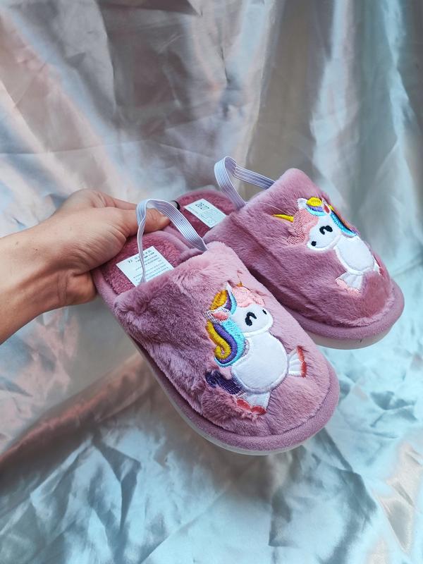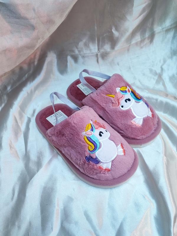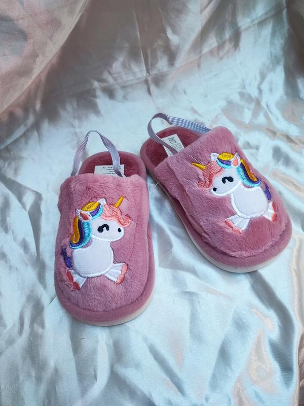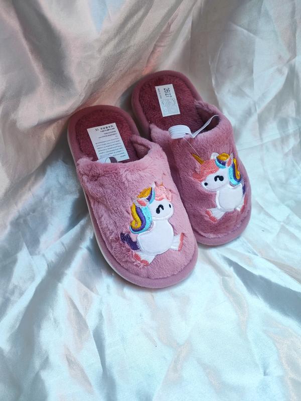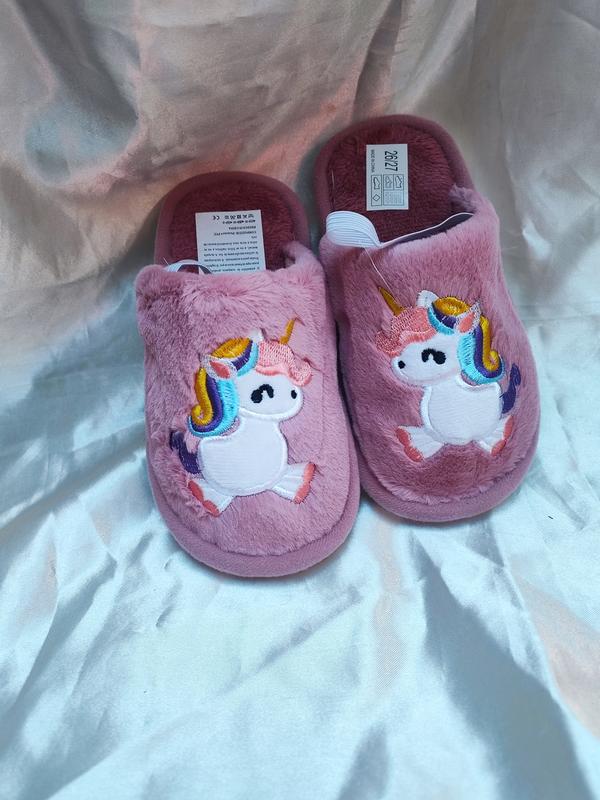 Детские тапочки розового цвета для девочки. Верх выполнен из текстиля и вышит единорогом. Материал подошвы вспененная резина. В середине текстиль.