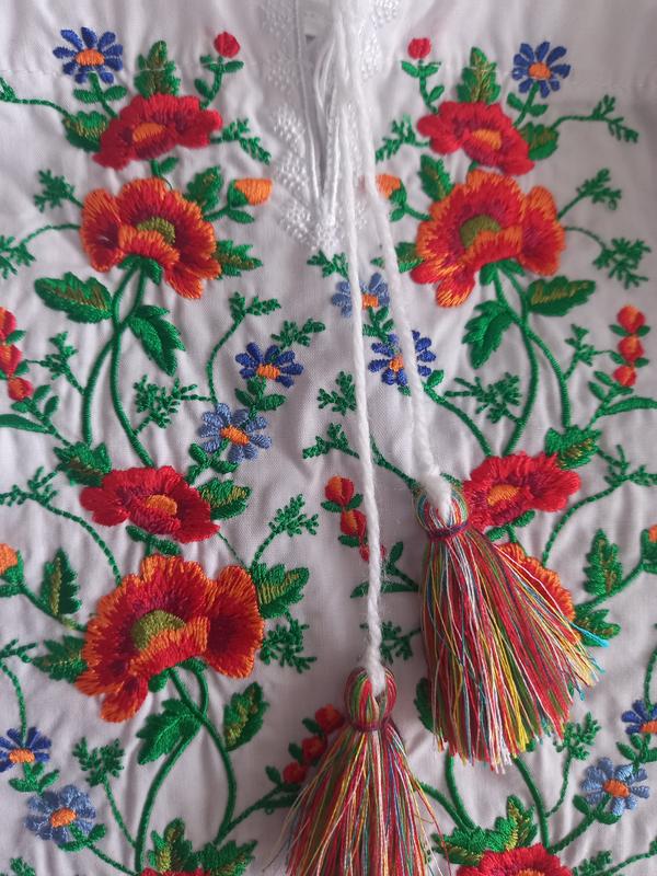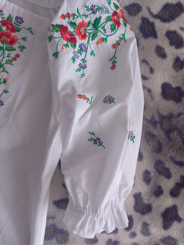 Вышиванка в идеальном состоянии, без следов носки вообще, ткань хлопок, цветная вышивка гладью, приятный принт цветами, удобный рукав 3/4, размер на рост 128, буле идеально с 5 лет, замеры сна