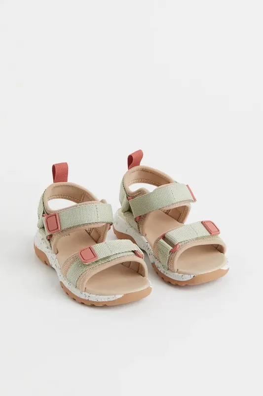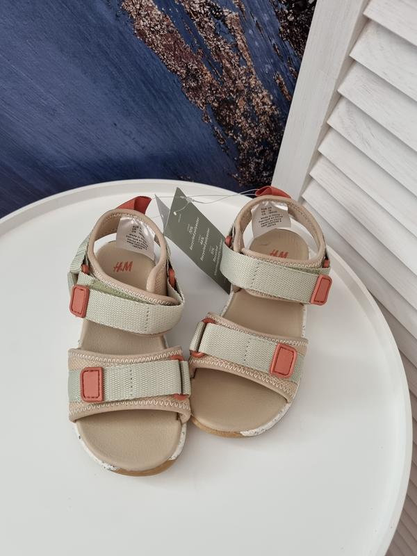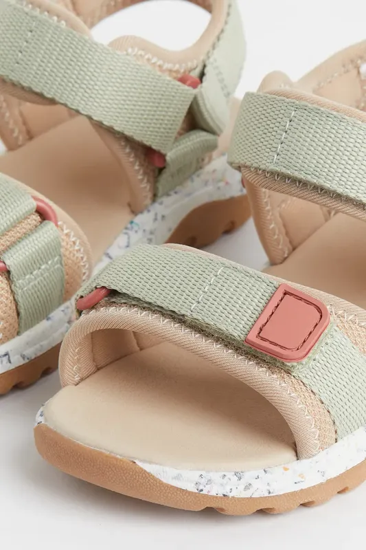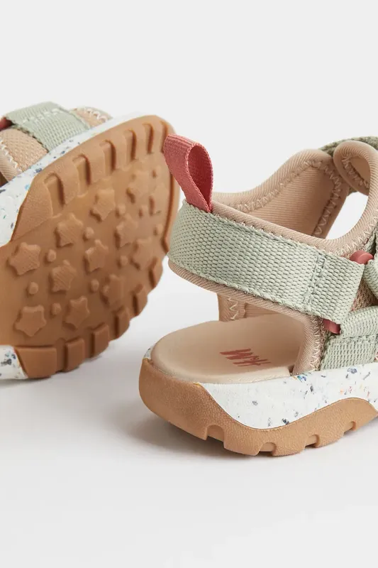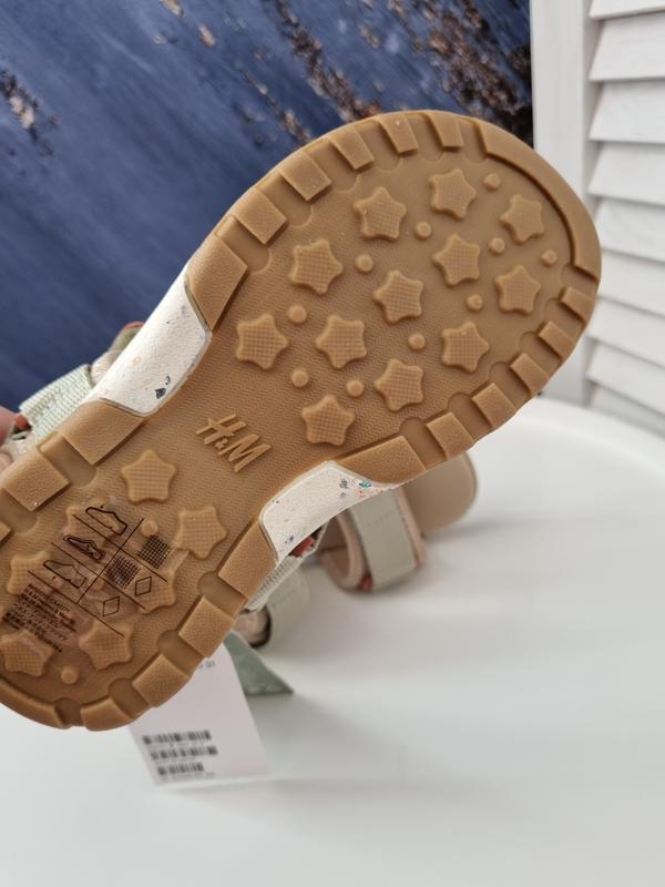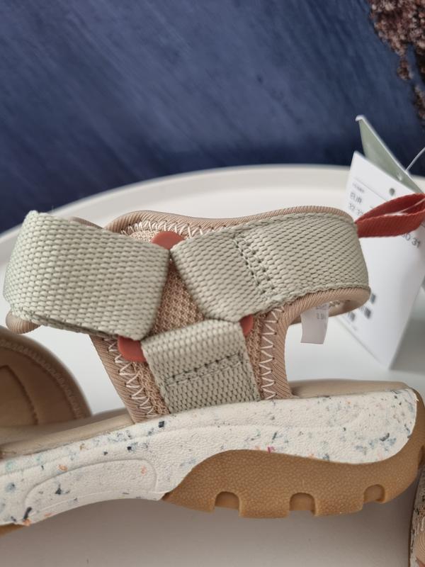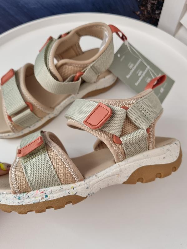 Сетчатые сандалии с ремешками в крупный рубчик и застежкой на липучке сверху. Небольшой пяточный ремешок помогает при надевании и снятии. Твердая, узорчатая, нескользящая подошва.
