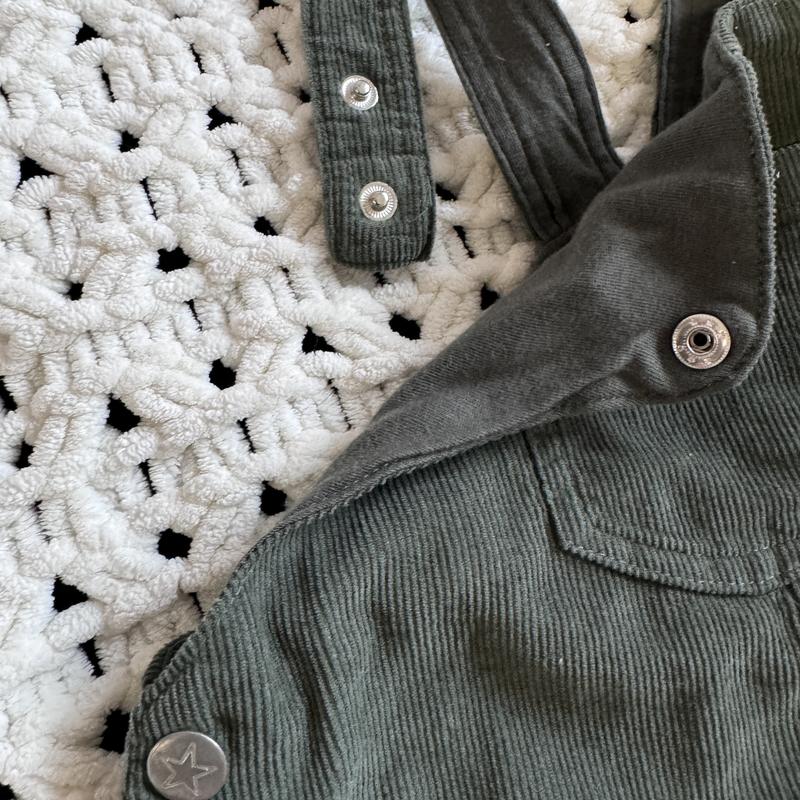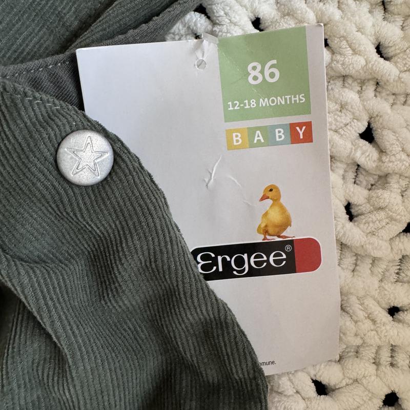 Очень крутые вельветовый комбинезон, длина регулируется. Без подкладки, но можно надеть под него нижний слой. Свободный и удобный крой. Новый. 12-18 мес.