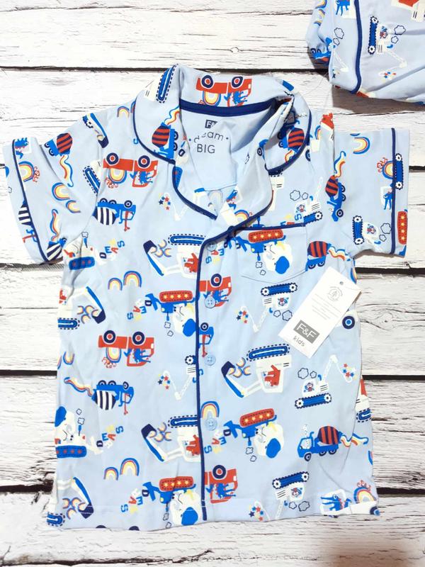 Пижама детская мальчишки шорты футболка рубашка на пуговицах с машинками строительной техн...