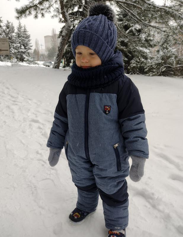 Очень теплый зимний комбинезон для мальчика. Утепленный синтепоном и флисом до колена, будет до -20. Стан идеален, носить мало,бо очень быстро вырос. На талии сбоку резинка, также резинка на капюшоне, чтобы плотно прилегало к лицу. Рукава и ножки на манжетах. Длина от плеча 84, длина рукава 38,корковый 38,ширина под подмышками 40.