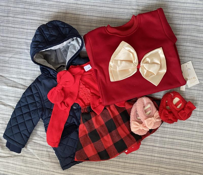 Курточка George 9-12 мес. Состояние 4/5 (покачанные манжеты рукавов). Сезон весна/осень. Боди-платье 9-12 мес. Новая! В комплекте повязка на голову. Пинетки 11,5 см. Новые! Прорезиненная подошва. Человечек на флисе 73 см. Новый! Крепится кнопочками снизу. Заміри надам. Можна придбати окремо. Курточка 150. Боди-платье 520. Пинетки 220 пара. Человечек 500.