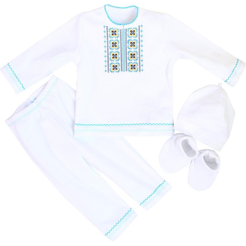 Костюм для крещения мальчика белый с национальными мотивами. Включает в себя все необходимое: кофту, штаны, шапочку, пинетки. Изготовлен из ткани интерлок, хлопок 100%.