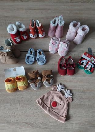 Фото 2-3 Жовті пінетки- носочки нові для новонародженого 1-3міс - 80грн Фото 4. Теплі пінетки 1-3, 3-6 міс: - плюшеві лисички, стан нових, устілка ззовні 11см - 80грн - червоні вязані пінетки з хутром в середині ззовні 11см - 75грн Фото 5-7. Набір теплих пінеток: - рожеві пінетки-чобітки h&m 16/17р - в стані нових, на ліпучках, на стопу 10-11см - 120 грн - теплі пінетки-чобітки smile, в середині на штучному хутрі 6-9міс 11см в середині - 120грн - рожеві пінетки-капці orsolino 3-6міс - стан нових, устілка ззовні 11см - 80грн. за 2 пари 180 всі в стані нових Фото 8. Коричневі пінетки-черевички 6-12 міс, устілка 11,5см, стан нових - 100грн. Фото 9. Набір шапочка хб + носочки теплі з оленем 3-6міс - 95 грн. Фото 10. Чешки сірі Smile 6-9 міс 11см - 65грн