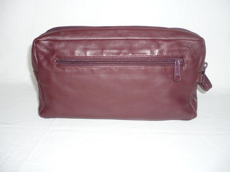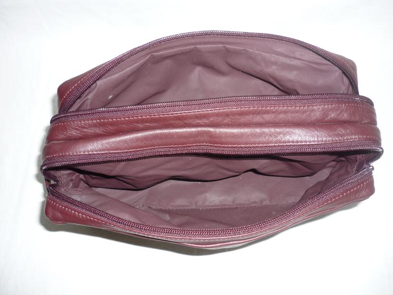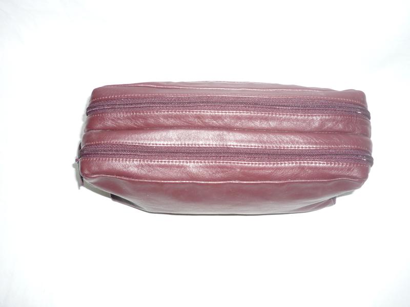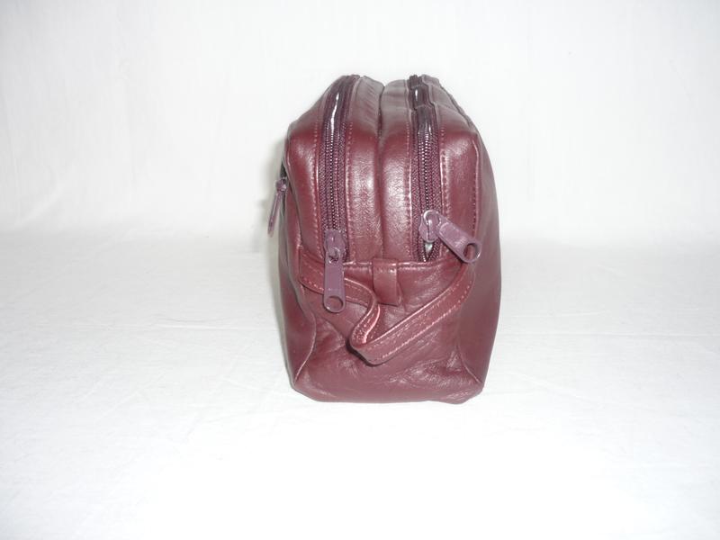 Велика, містка, дорожня сумка-косметичка бордового кольору. Має два відділення на блискавках та ручку для переносу. . З зовнішньої сторони - врізна кишеня на блискавці. Стан б/в - дуже гарний, без дефектів та нюансів, якісна фурнітура, блискавки YKK. Матеріал - натуральна шкіра, дно - штучна шкіра, підкладка - штучний матеріал. Габарити: висота - 13,5 см., довжина - 25 см., глубина - 9 см.