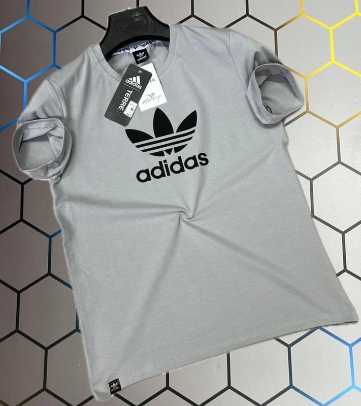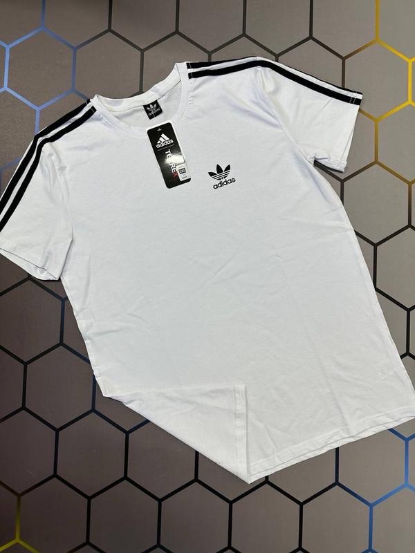 Фирменная хлопковая футболка в бело - серую полоску с принтом adidas neo label