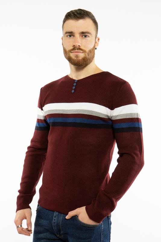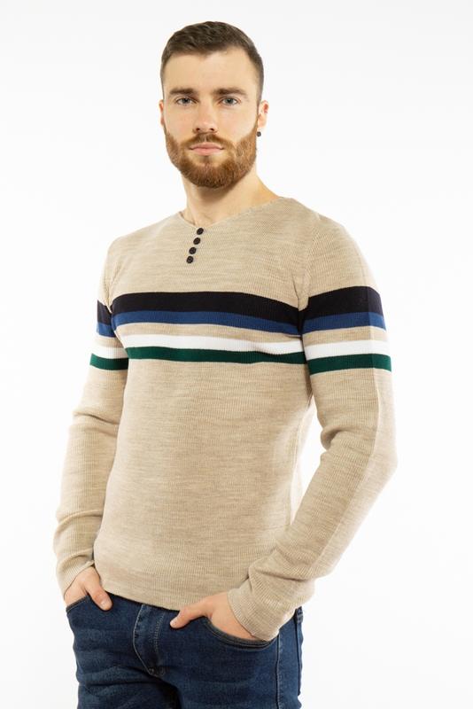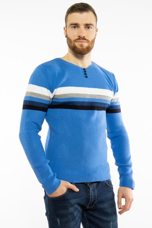 Оригинальный, мужской вязаный свитер, выполнен из пряжи в состав которой входит натуральная шерсть и акрил, благодаря чему обеспечивается тепло и комфорт в сочетании с неприхотливостью в уходе. Декоративное оформление изделия, заключается в наличии широких, разноцветных полос по груди и рукавам в области плеч, а также небольших пуговиц, имитирующих застёжку V-образной горловины.