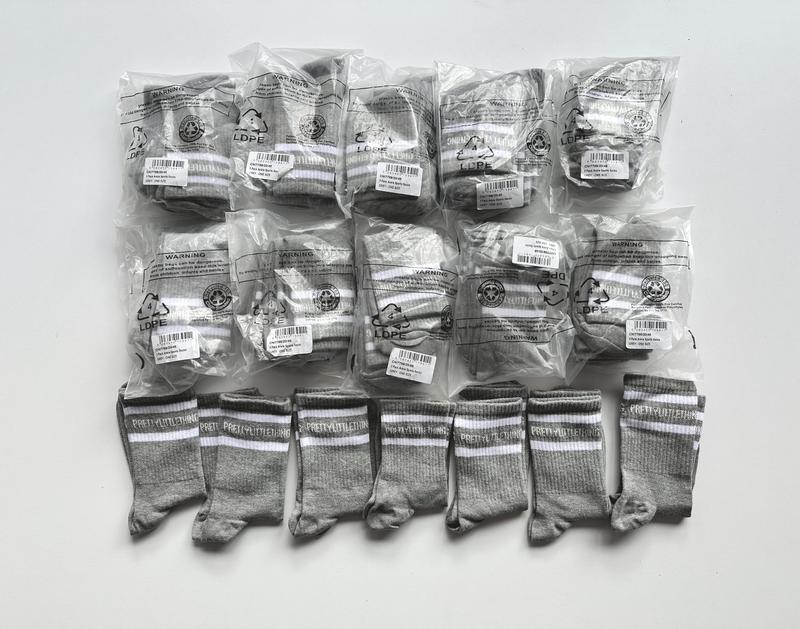 Носки сірого кольору PrettyLittleThing Розмір універсальний вказано Упаковка - 3 одиниці 72% бавовна 22% поліестер 3% нейлон 3% еластан Бренд Великобританія Виготовлені в Єгипті Можливий великий опт, в наявності близько 80 пар