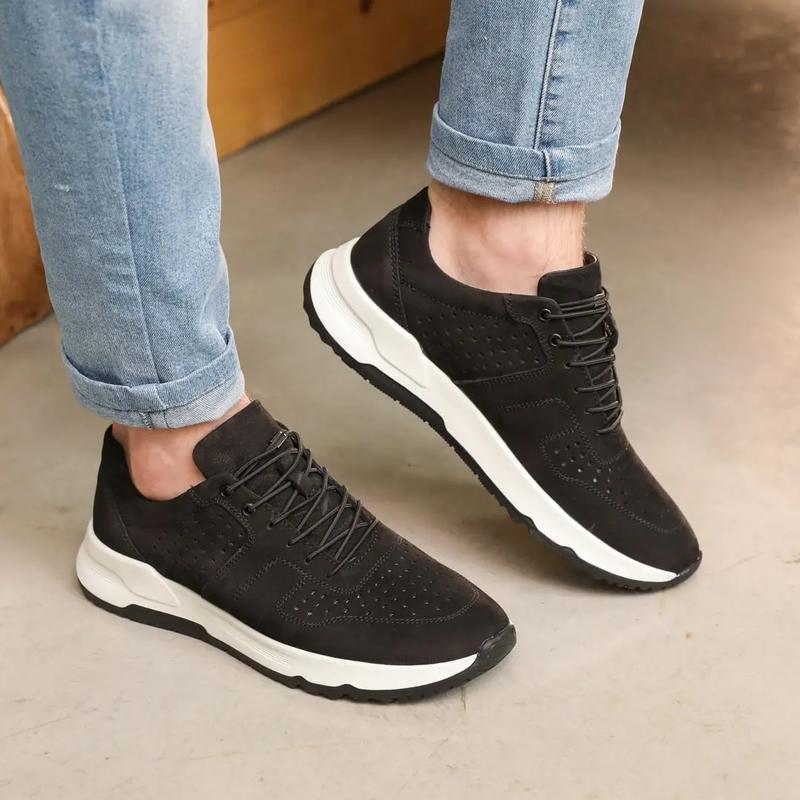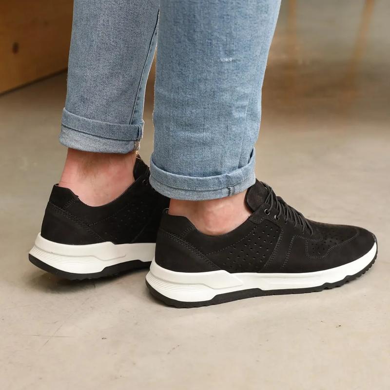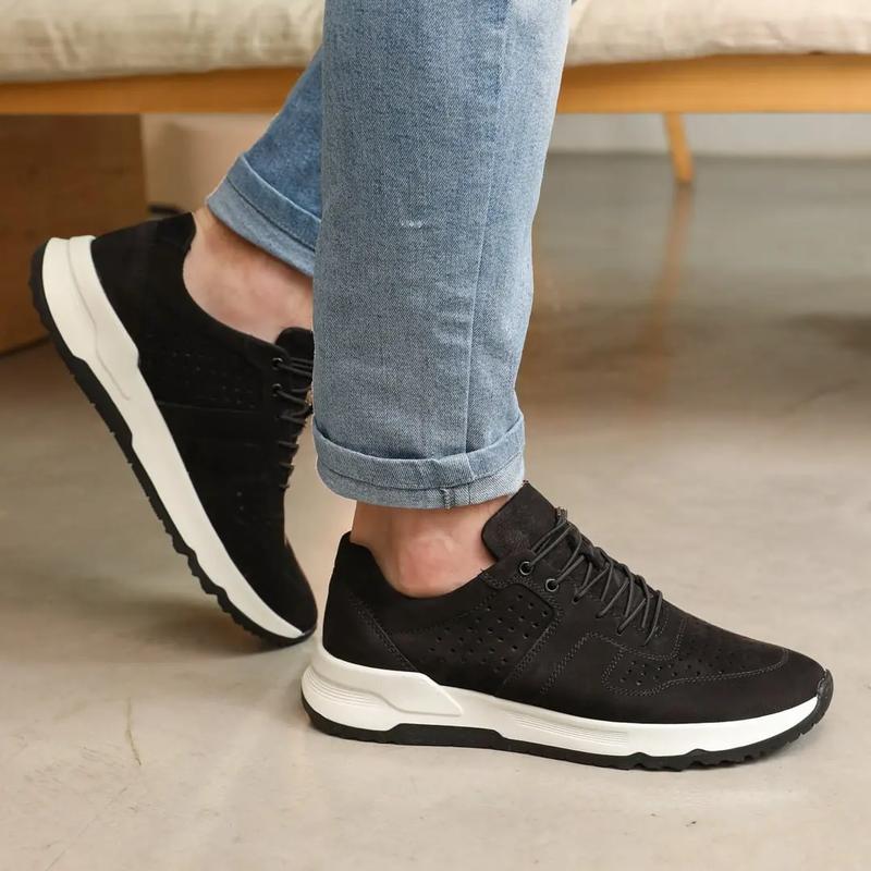 Стильные мужские кроссовки черные с белой подошвой кожаные/нубук деми, демисезонные осенние, весенние, летние (на осень, весна, летом 2023-2024)