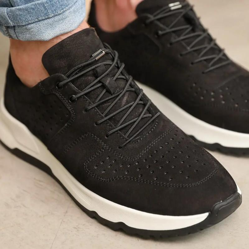 Стильные мужские кроссовки черные с белой подошвой кожаные/нубук деми, демисезонные осенние, весенние, летние (на осень, весна, летом