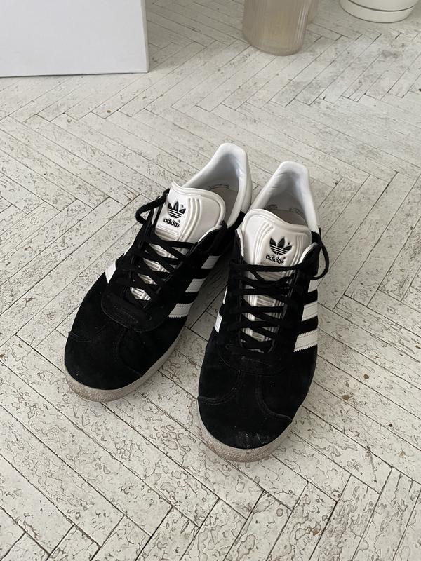 Черные кроссовки Adidas Gazelle.З замші. В хорошем состоянии, без дырок, подошвы цели, не разношенные. Есть легкие признаки использования.Размер -- 43 европейский (размерную сетку добавил на фото, на язычке).
