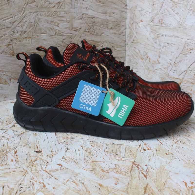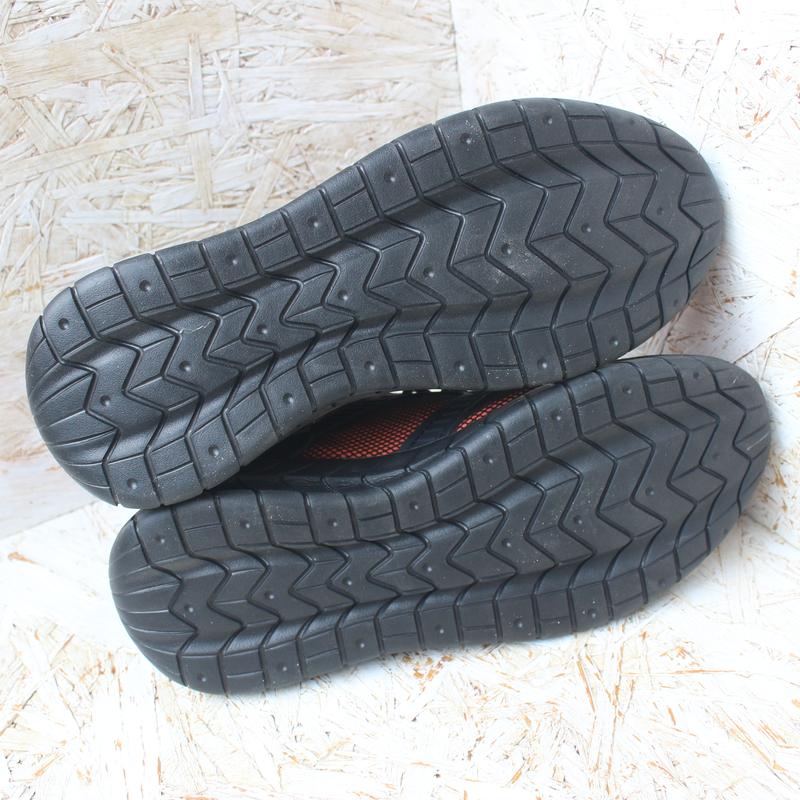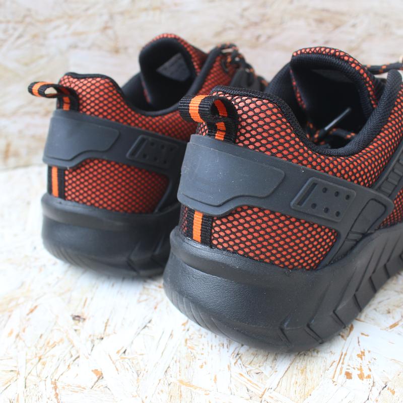 Материал: текстиль. Цвет оранжевый, но они не слишком яркие благодаря черной сетке сверху. Подошва - пена, легкие.