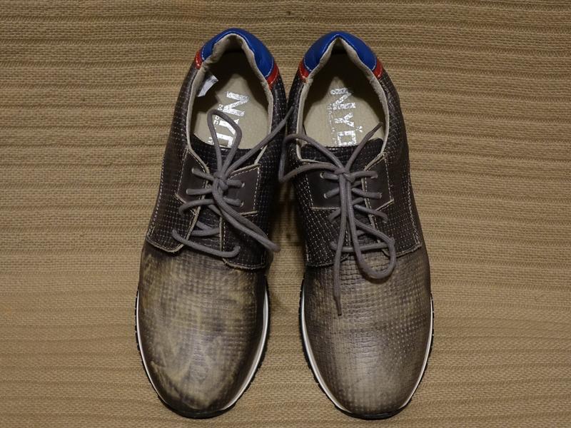 Верх изделия выполнен из толстой мягкой гладкой фактурной ( как бы объемное плетение тонких кожаных ремешков) натуральной кожи темно-серого цвета с фирменной " выбеленностью" передней части изделия. Объемный задник выполнен из толстой гладкой натуральной кожи темно-серого цвета. В верхней части задника есть вставки из мягкой гладкой натуральной кожи синего и красного цвета. Язычок мягкий кожаный бесшовный. В верхней части планок для шнурования пришиты небольшие вставки из гладкой натуральной кожи серого цвета. Модель фиксируется на ноге при помощи объемных круглых мягких вощеных шнурков светло-серого цвета, которые продеваются через 4 пары аккуратных отверстий. Все детали изделия отстрочены ровным двойным швом прочными нитками контрастного белого цвета.