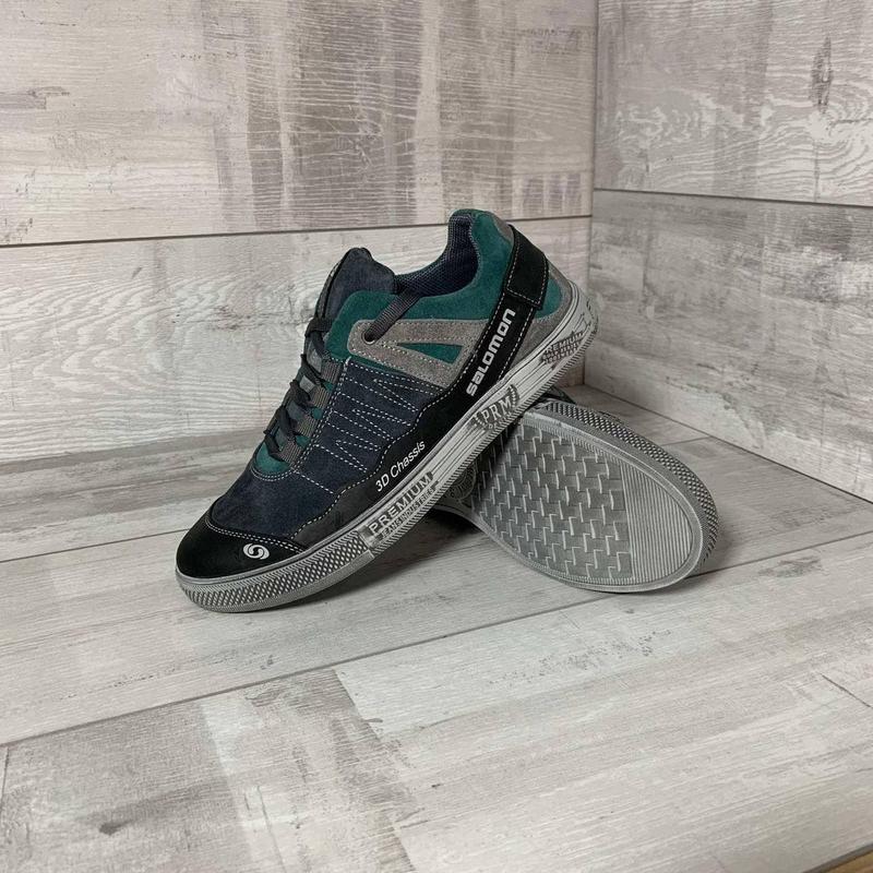 Мужские кроссовки Salomon зелено-серого цвета из нубука со вставкой Crazy кожи. Кроссовки демисезонные, пригодны для носки весной, летом, осенью.