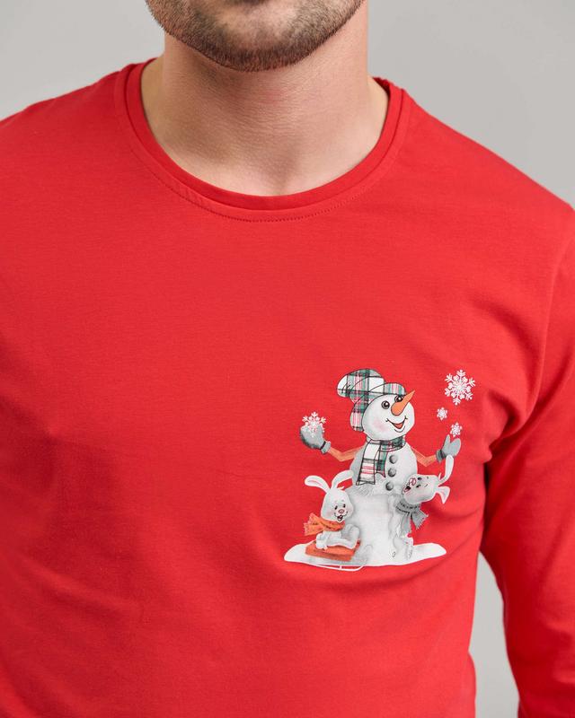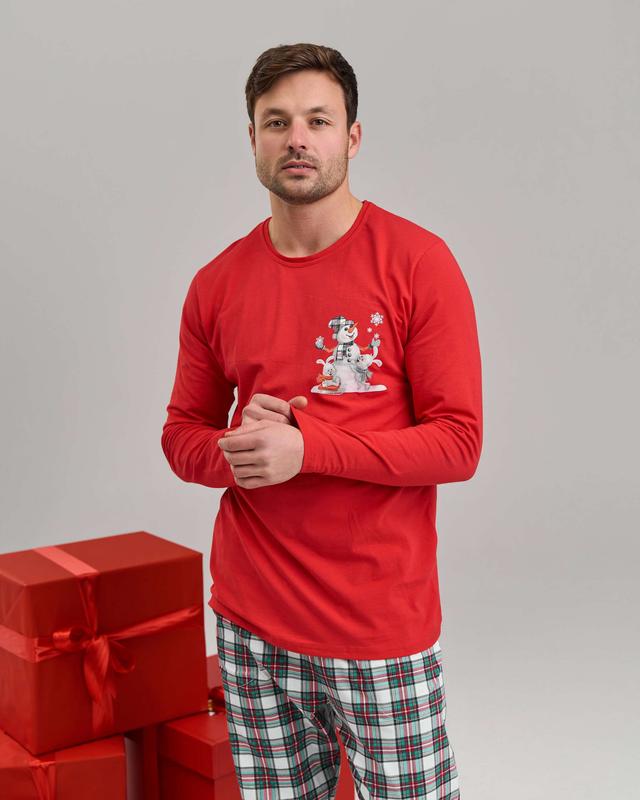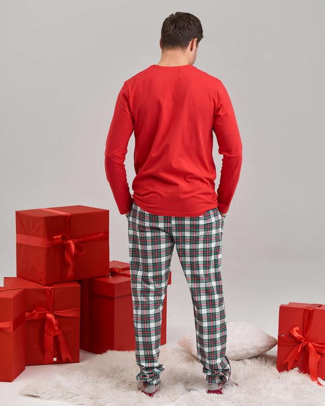 Мужская коттоновая пижамка с новогодним принтом. Брюки в клетку с карманами и манжетами. Также такой комплект может служить как домашняя одежда и может быть отличным подарком под елку.