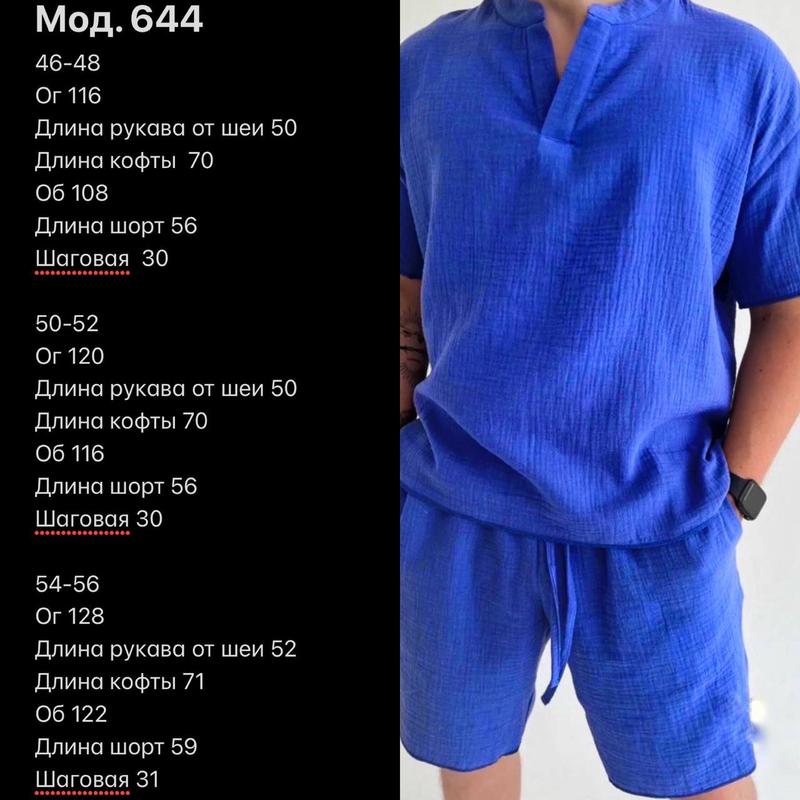 Мод. 644Костюм из натуральной дышащей ткани, не парит Ткань турецкий муслинРазмер 46-48, 50-52, 54-56Цвет молоко, оливка, черный синийЦена 699 грн.
