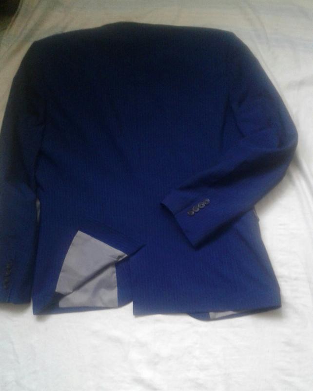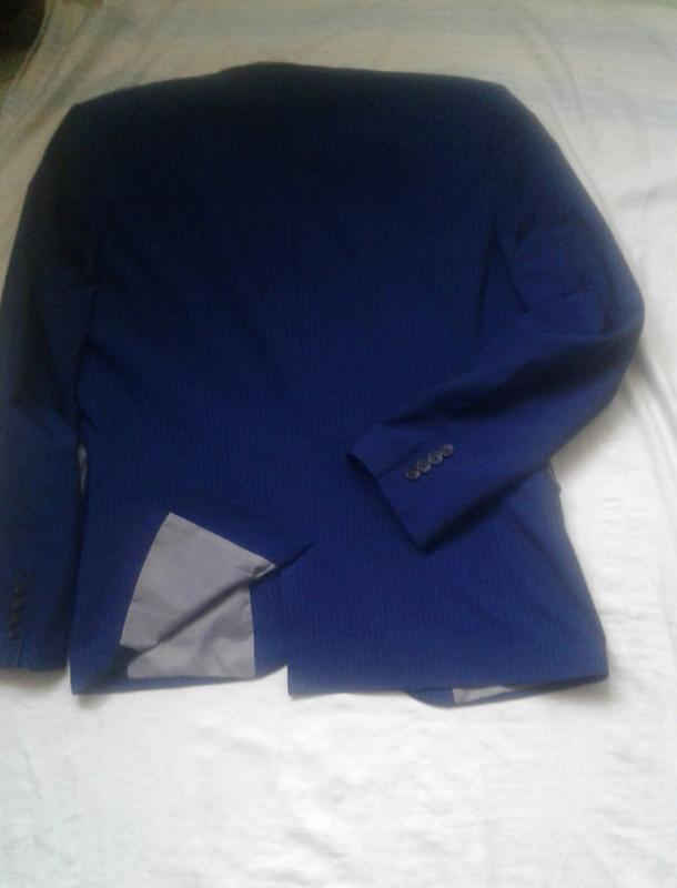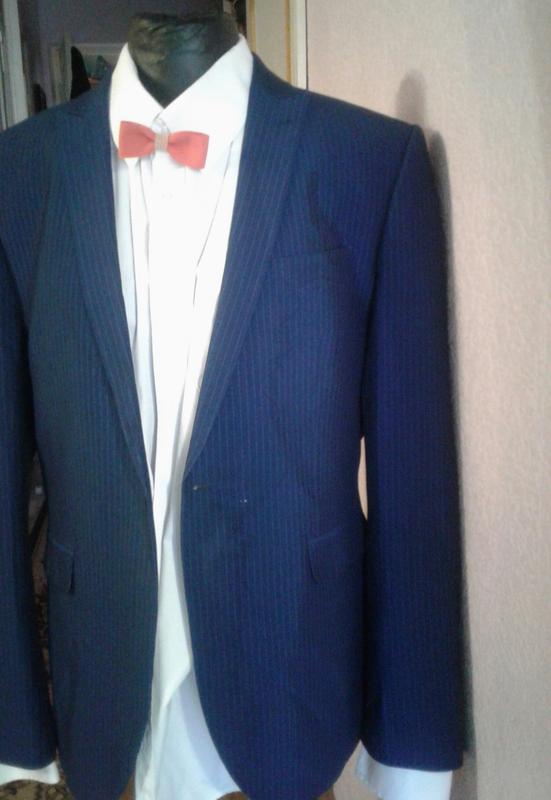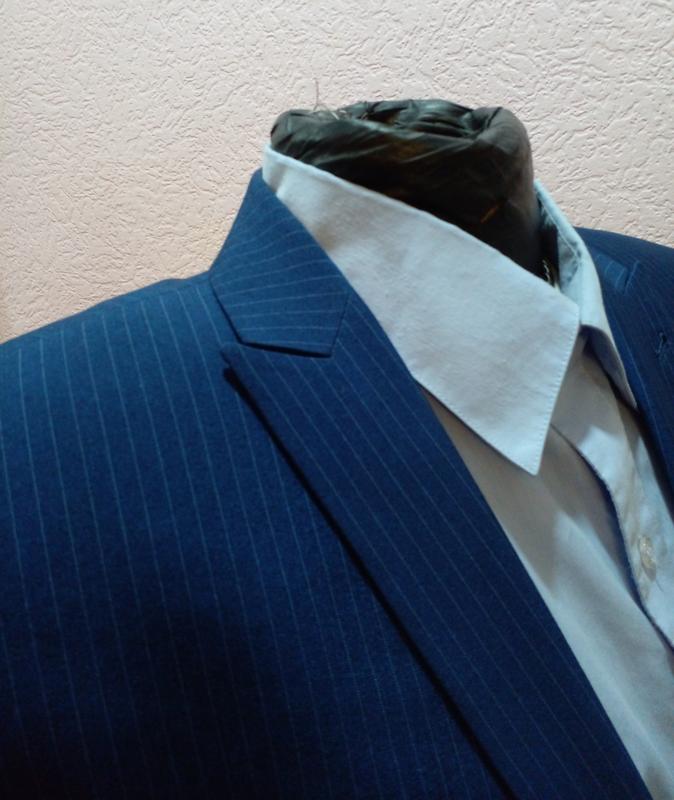 красивый стильный классический костюм синего цвета в тоненькую полоску . Длина пиджака 72 см плечи 47 см длина рукава 66 си пог 55 см . Длина брюк 110 см шаг 86 см пот 45-46 см поб 53 см Ширина низа по 18 см . Без нюансов