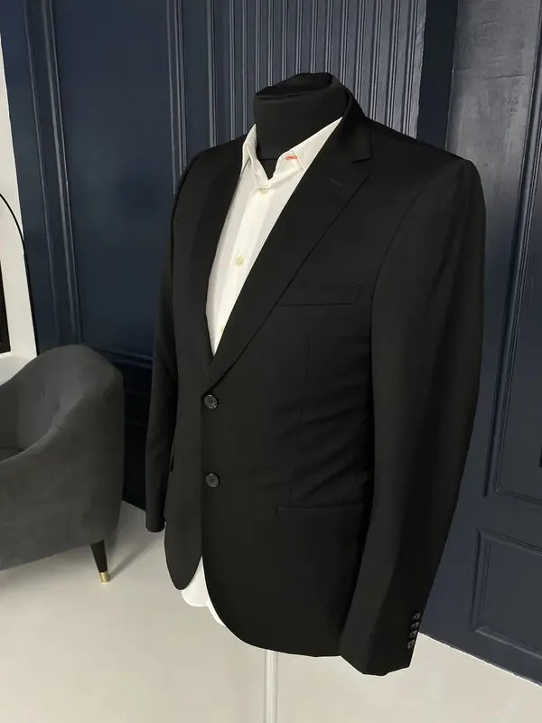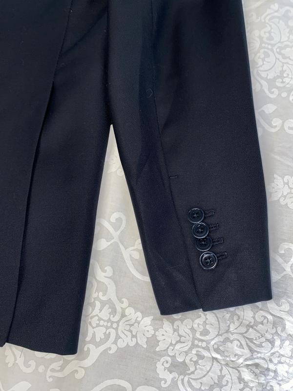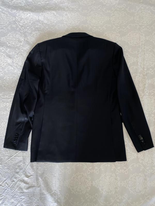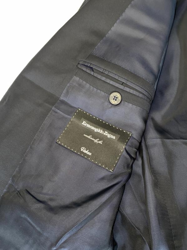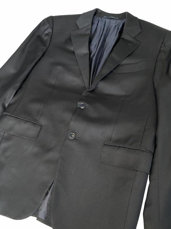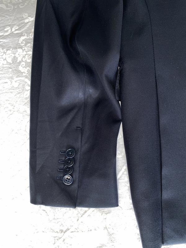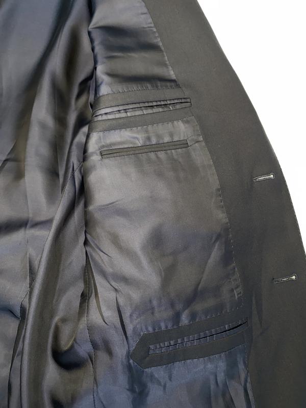 Мужской пиджак Ermenegildo Zegna. Черного цвета, поти церный. Спереди 3 кармана. Застегивается на 2 пуговицы. По 4 пугавицы на руковах. По бокам пиджака разрезы - 23см. Изнутри 3 больших кармна, 2 из них с возможностью застегнуть на пугавицу и 2 маленьких ( под зажигалку или ручку).