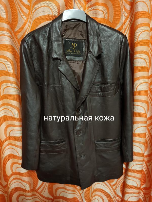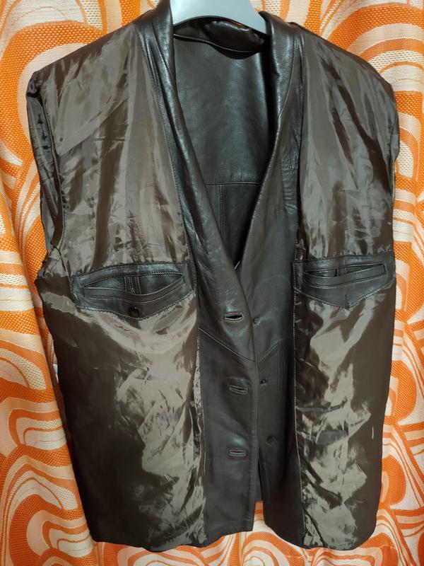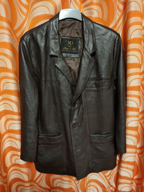Он шикарный! Состояние нового! Сложный, благородный цвет темного шоколада с бордовым подтоном. Мягенькая овечья кожа. Крой прямой, на три пуговицы, спереди три прорезных кармана, спинка без шлицы.