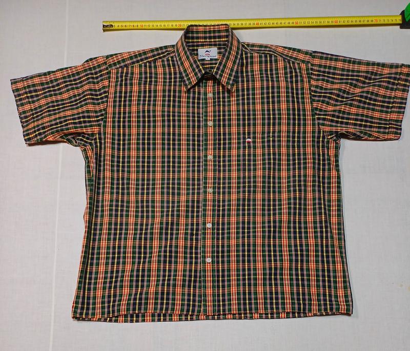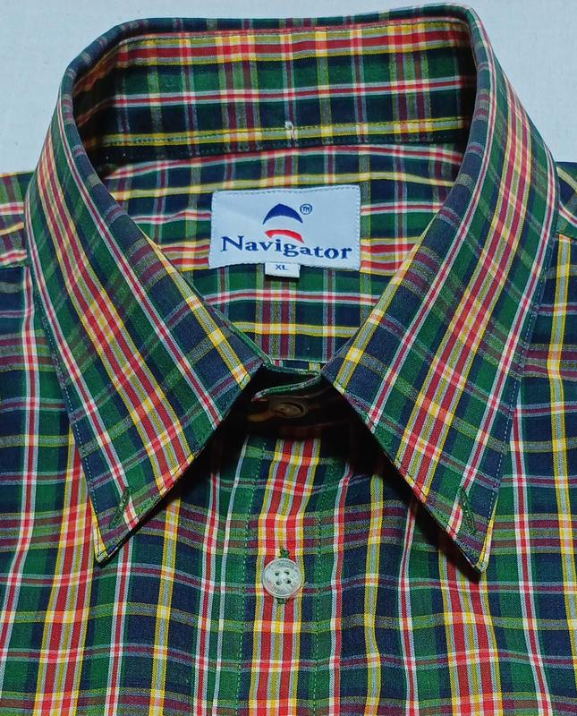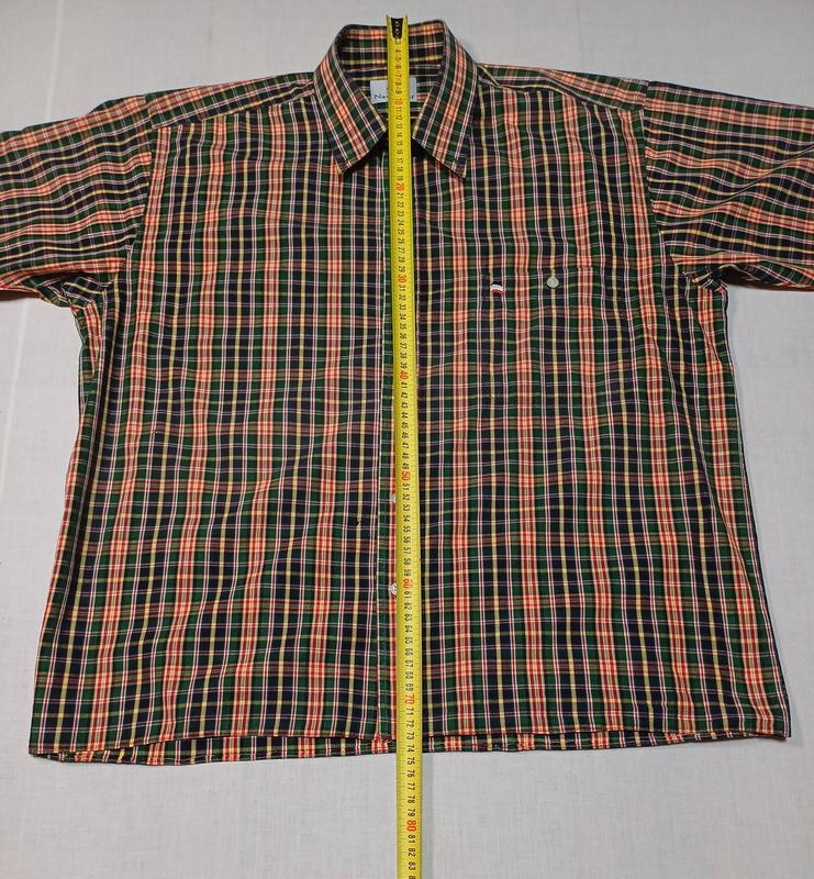 воротник 43 см NAVIGATOR SIZE XL рубашка в зеленокрасную клетку BOMULL 100% замеры: 1) ширина плечей 53 см 2) обхват груди 65 см 3) обхват талии 64 см 4) длина по спине 74 см 5) длина рукава 26 см