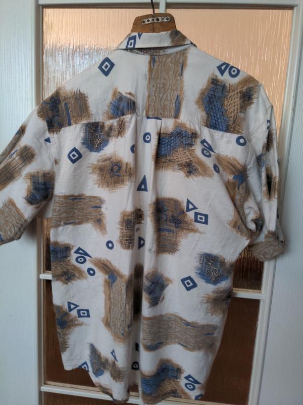 разноцветная, почти гавайка, из материала, состоящего из льна и хлопка. кстати, материал, довольно плотный и толстый. и очень качественный. рубашка нарядная и освежает. размер указан L. замеры см. плечи 55, подмышки 63, длина по спинке 72, рукав от плеча 27.