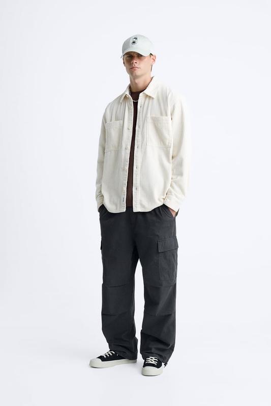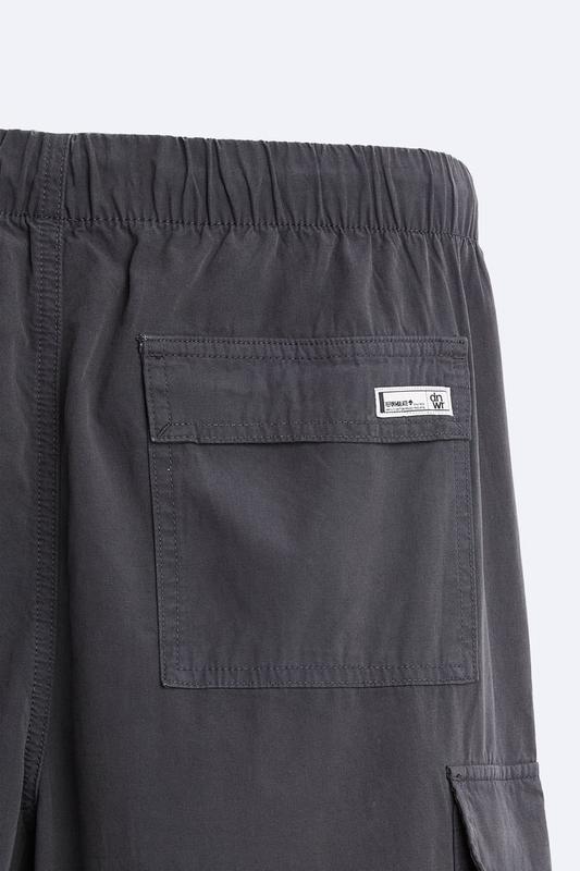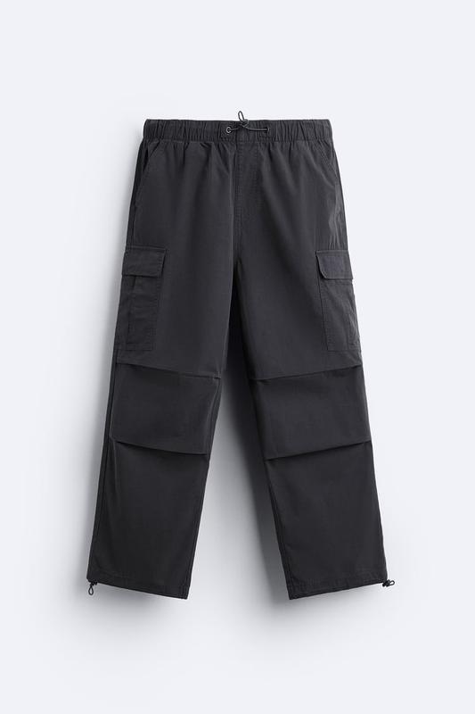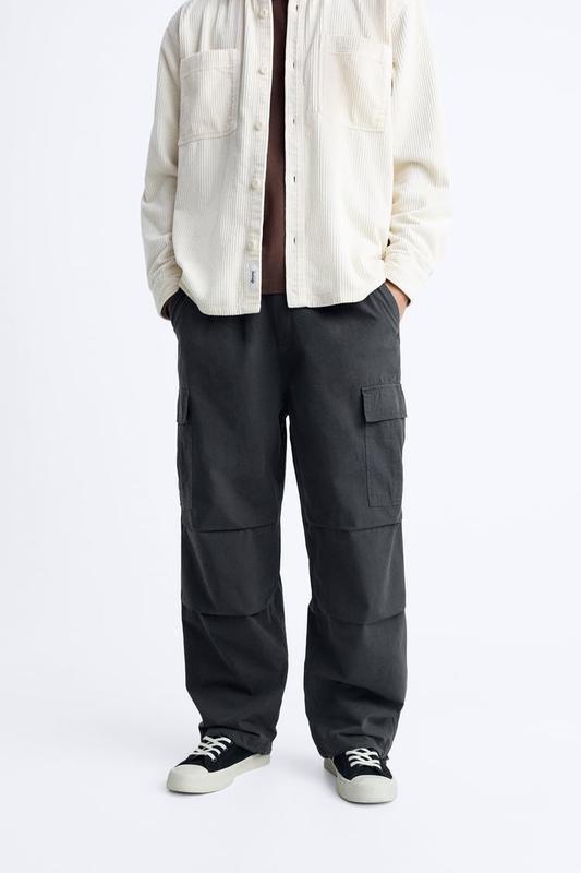 Мужские штаны Zara Cargo (оригинал) свободного кроя с регулируемым эластичным поясом с карманами спереди и сзади с накладными клапанами. Накладные карманы с клапанами на штанинах, плиссированные штанини на коленях, регулируются внизу резинкой по бокам, темно-серого цвета, размер S, новые