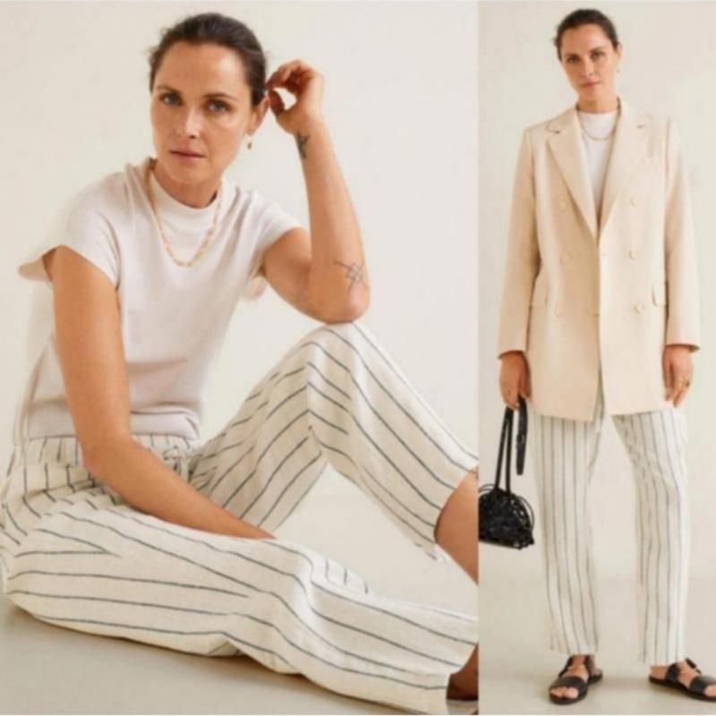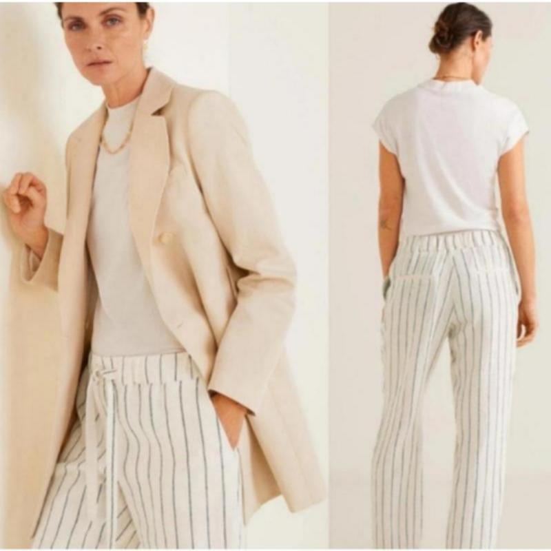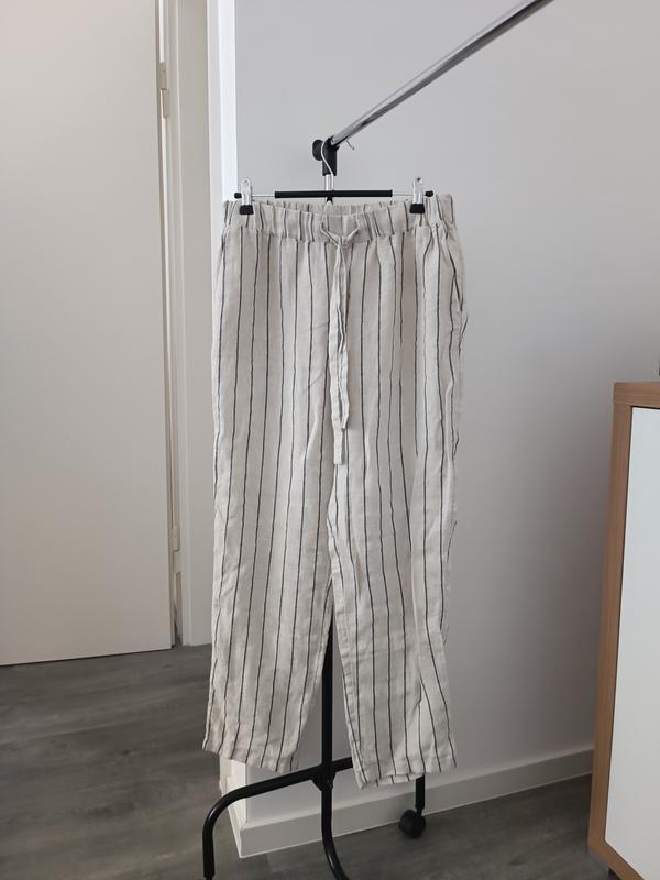 брюки, брюки светлые в полоску, цвет между светлый беж и белый. Mango, размер на этикетке M, или подойдут на небольшой L. новые, без магазинной бирки, без недостатков. Стиль- повседневный ( casual), комфортная посадка, лен 💯, карманы - 65 полиэстер, 35 хлопок. Брюки на резинке, веревок - регулятор, 2 кармана по бокам. Длина 96 см, длина внутреннего шва 72 см, посадка спереди 30 см, сзади 33 см. талия резинки в покое 38 см полуобхват, тянется до 44 см полуобхват, ширина штанины внизу 18 см, бедра 56 см