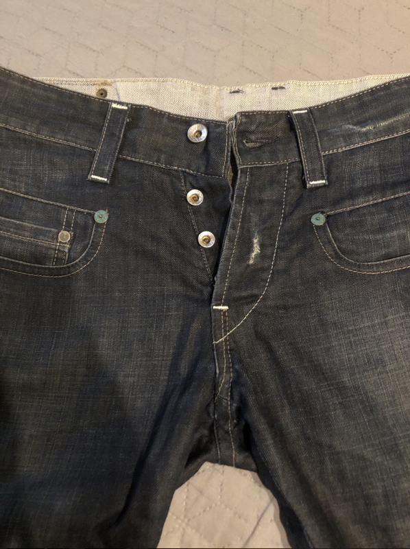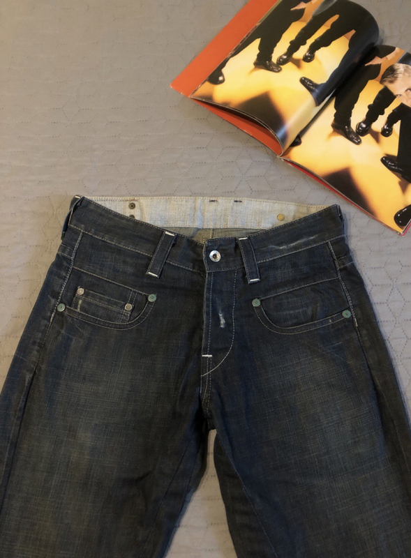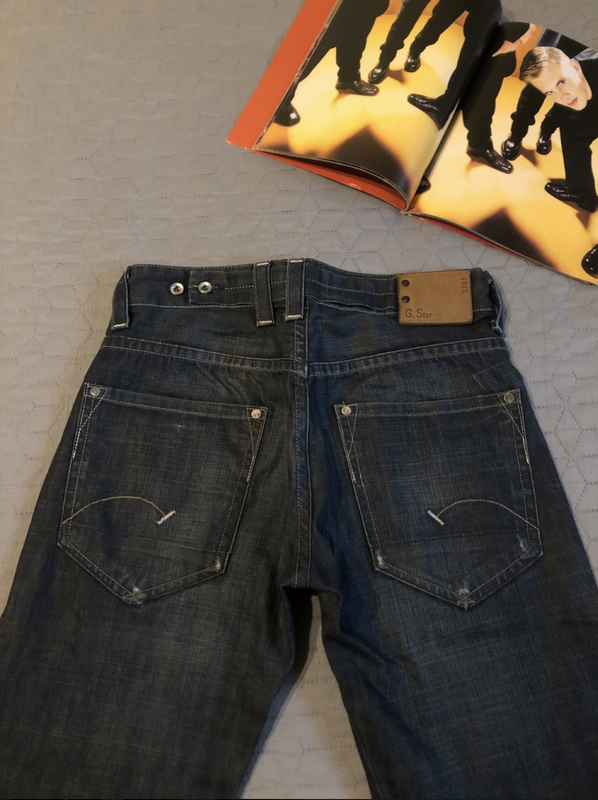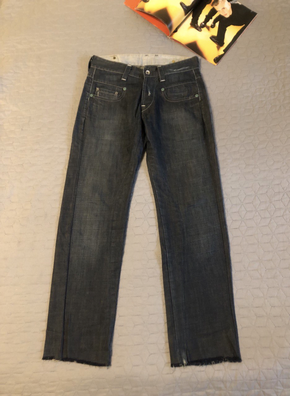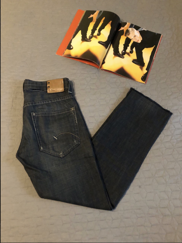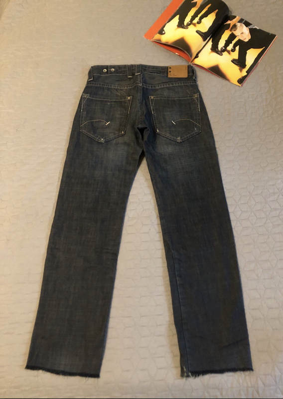 Очень классные брендовые джинсы от G-Star RAW темно-синего цвета с выборочным вывариванием и рваными местами, низ штанин не обработан. Оригинал, привезенный из Штатов, логотип на кожаной бирке, на металлических кнопках и на пуговицах на ширинке. Интересно сделанные вставки на внутренней стороне, есть сзади специальный хлястик, которым можно убавить пояс, 100% котон. Состояние идеальное. Размер указан 28, могут идти и на 29-30. Длина по наружному шву 204 см, по внутреннему шву 81 см, в поясе ширина 42 см.