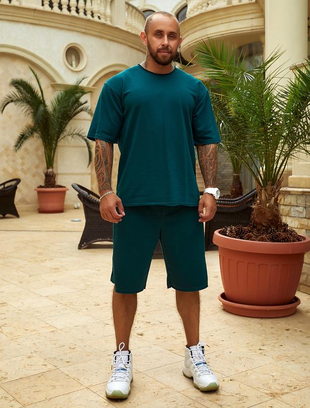 Костюм мужской летний двойка (футболка+шорты) melgo из двунити пенье тёмно-зелёный s-m