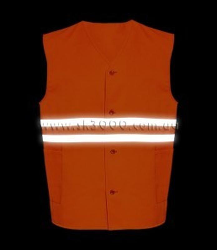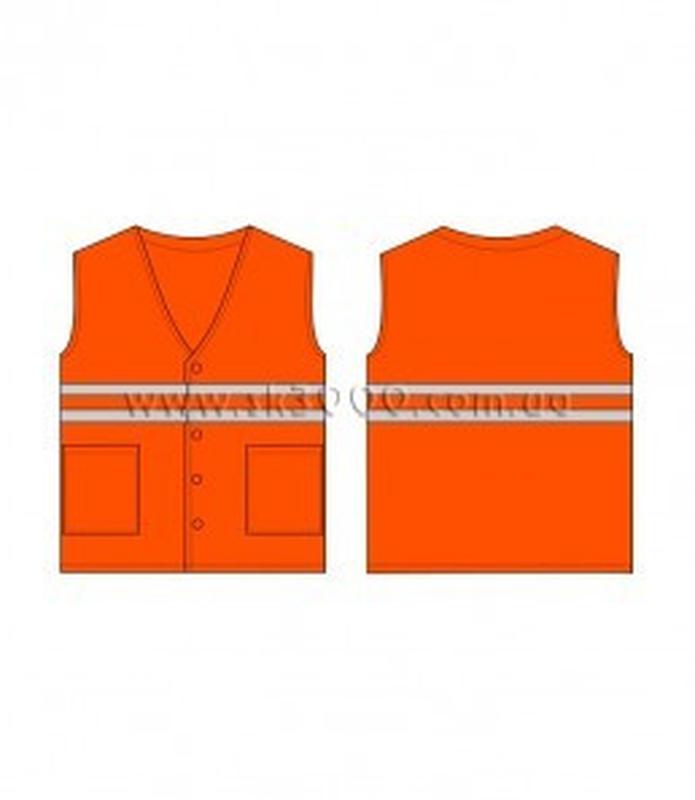 На жилет нашита горизонтально, у два ряди, світловідбиваюча стрічка.Застібається на гудзики. У жилетковій частині пришиті, два накладні боковікишені.