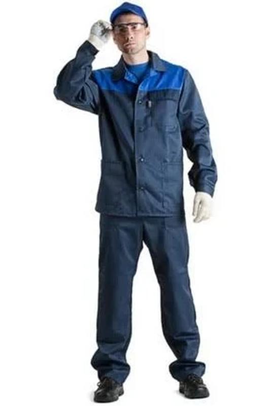 Костюм рабочий состоит из куртки и брюк. Куртка прямого силуэта, воротник отложной, три накладных кармана, центральная боковая застежка на пуговицы, отрезная кокетка отделочного цвета. Брюки с двумя накладными карманами, застежкой на пуговицы; притачной пояс, шлевки под ремень. Ткань: грета, 53 хлопок, 47% полиэстер, плотность 220 г / м2. По желанию заказчика можно выполнить костюм с любой ткани. Количество и цену согласовывать с менеджером.