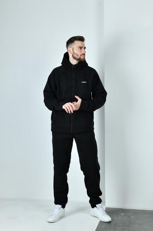 Мужской спортивный костюм Код 3663 Ткань: трехнитка на флисе (с начесом). Цвета: черный. Размеры: 56-58 Длина куртки: 75 см. Длина рукава от горл.: 81 см. Обхват рукава: 48см. Длина брюк по внешнему шву: 110 см. Длина брюк по внутреннему шву: 80, 81, 82, 83, 84 см. Замеры готового изделия: Куртка 56-58 ОГ 126 ОТ 126 Штани 56-58 ОТ 86/122 ОС 122 Тепленький спортивный костюм из трикотажа трехнитки с начесом ( растяжимость средняя). Зип-худи с двойным капюшоном, в кулиску которого продет шнурок. Рукав-реглан, на манжетах. Спереди обработанные карманы. Застегивается на молнию. Брюки со средней посадкой, по талии собраны на резинку, в кулиску продеты шнурок. Низ на манжетах. В боковых швах обработаны карманы.