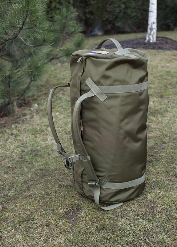 Баул оснащен 2-мя нейлоновыми лямками для переноски как рюбзак, которые регулируются пряжками, так и в руках как обычную сумку. Дополнительные ручки переноса расположены на торцах сумки-баула, что делает удобным его в перенос в вертикальном положении, или горизонтально или вдвоем. Все стропы пришиты усиленными швами высококачественной нитью, в местах наибольшей нагрузки швы усилены накладками из стропы. На верхнем торце размешенная велкро накладка для фиксации нашивки с прививкой.