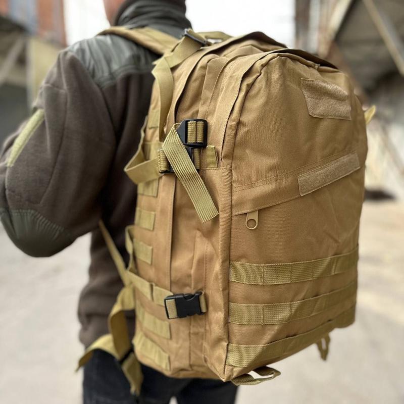 Тактический военный армейский рюкзак на 35 литров. Койот Качественный тактический рюкзак. Подойдет для длительных пеших прогулок, рыбалки, охоты. Крепкий и надежный. Размер: 49x34x16 Объем: ~ 35 л Материал: оксфорд (водоотталкивающий) Цвет: койот Вес: 0,9 кг Характеристика: - 2 больших отделения на молнии; - фронтальный карман на молнии; - дополнительное отделение в главном отсеке; - стропы Molle для крепления подсумков; - D-образные кольца на лямках; - удобные широки е плечевые ремни, с регулировкой; - боковые стяжки, регулируемые толщину рюкзака; - ручка для переноски в руке.