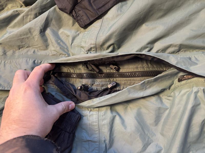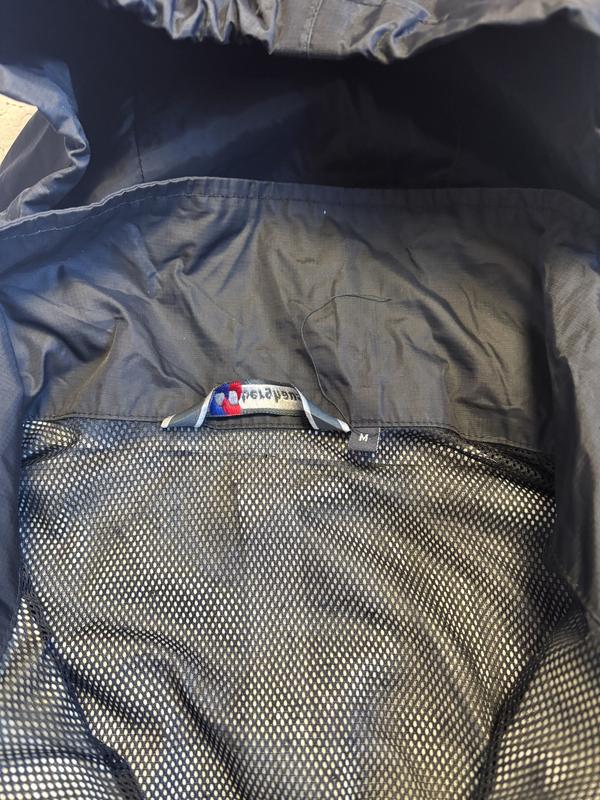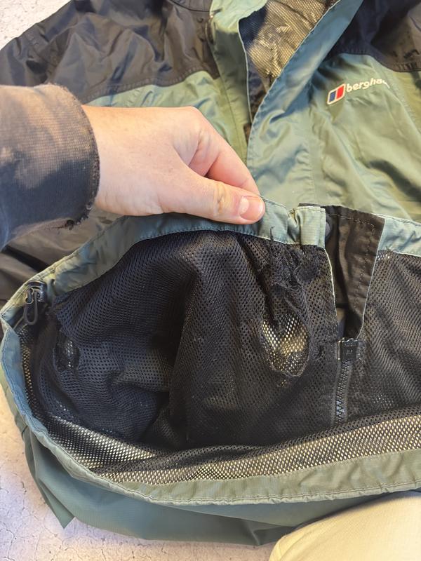 Единственный момент это порвалась сетка в кармане(указал на фото)нужно посшивать ее и в целом никак не влияет на функциональность и использование,мембрана целая и идеально отталкивает воду,так же ветронепродуваемая