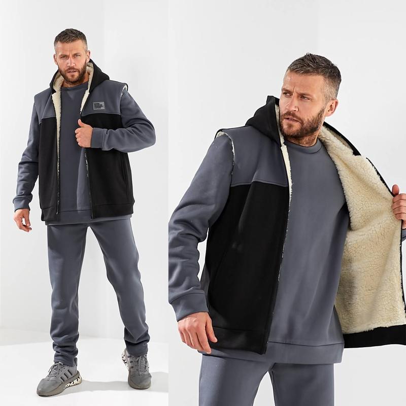 Костюм тройка (жилет + свитшот + брюки)арт. vla. 5383Размеры: 48-50, 52-54, 56-58Маркировка: 1, 2, 3Ткань: костюм трикотаж 3-х нить на флисе, жилет - трикотаж 3-х нить на флисе, подкладка - эко мех Цена : 1840 грн