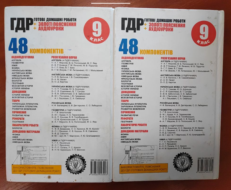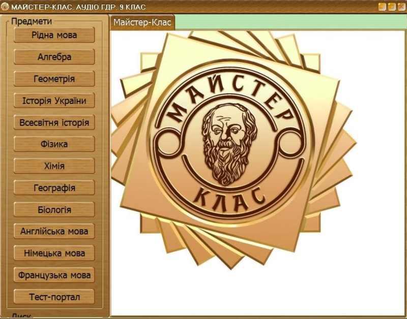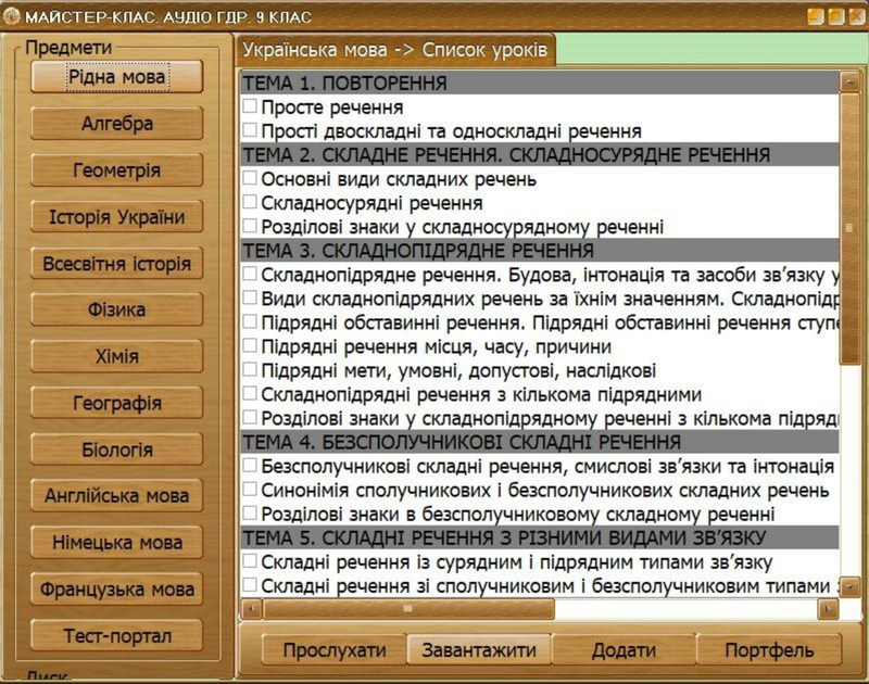 Аудіопідготовка: Алгебра, Геометрія, Хімія, Фізика, Українська мова, Англійська мова, Німецька мова, Французька мова, Біологія, Географія, Всесвітня історія, Історія України.