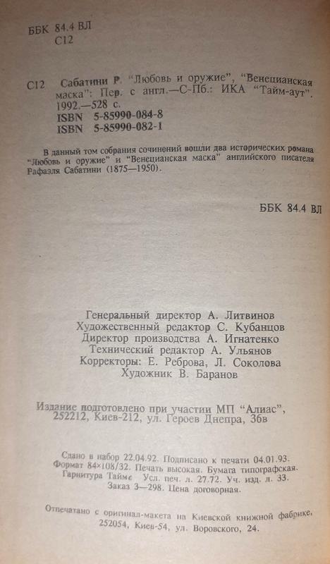 В данный том собрания сочинений вошли два исторических романа "Любовь и оружие" и "Венецианская маска" английского писателя Рафаэля Сабатини (1875-1950).Любовь и оружие. Венецианская маска. Рафаэль Сабатини. Арт.957. ИКА "Тайм-Аут", Киев 1992