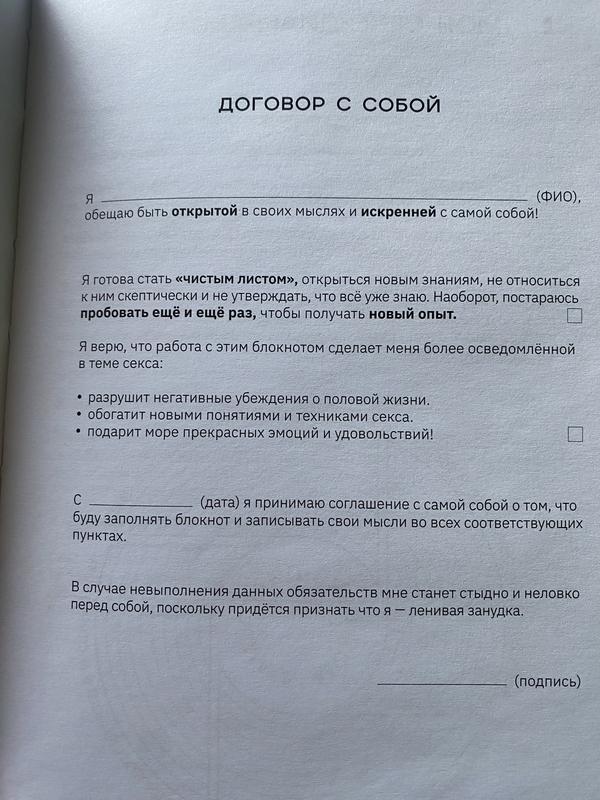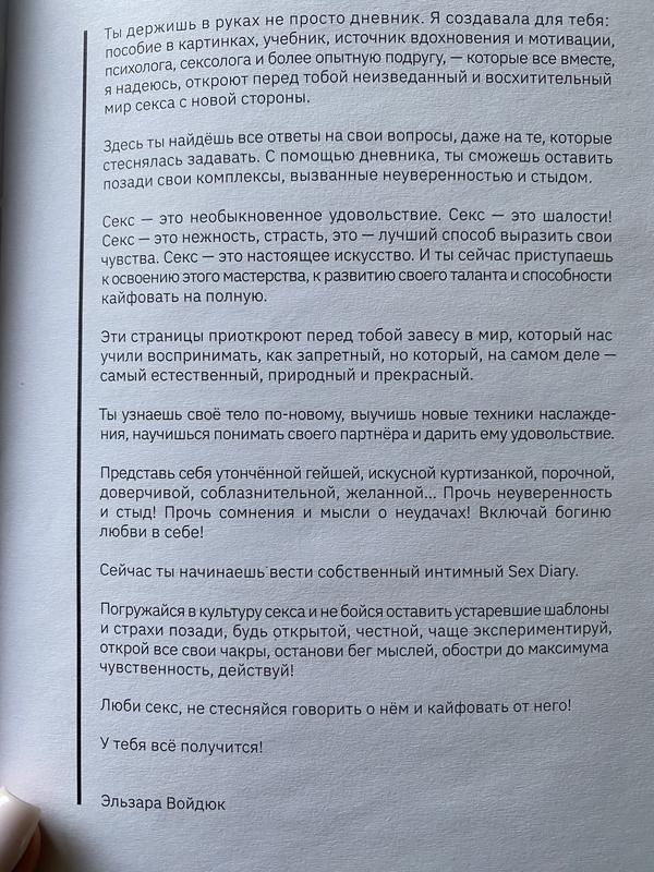 Теперь это все доступно — нужно только купить интимный дневник Sex Diary, каждая страница которого посвящена различным видам секса, физическим удовольствиям и практикам и максимальному удовольствию. Есть место для записи своих идей, достижений и результатов экспериментов!